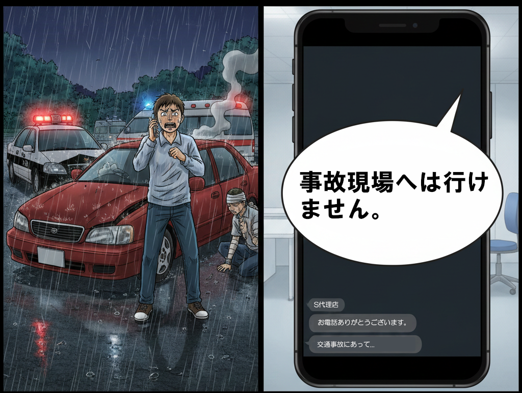 「事故の受付はできますが,事故現場へは行けません。」